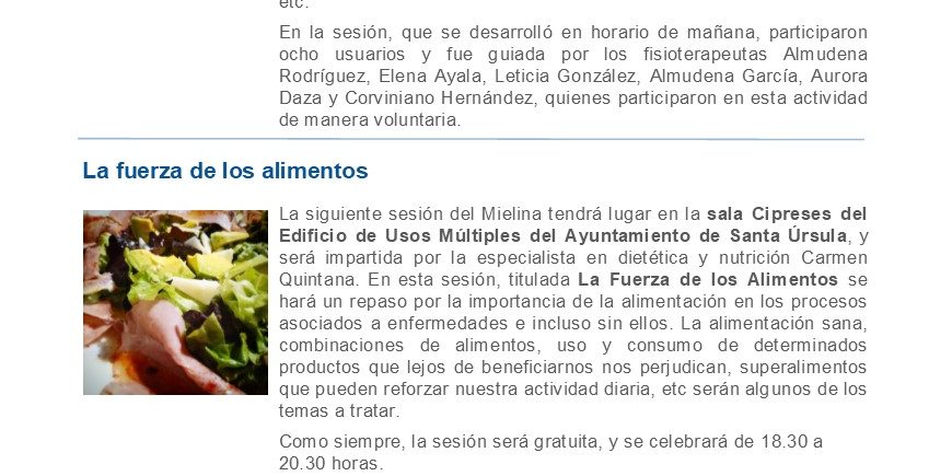 La siguiente sesión del Mielina tendrá lugar en la sala Cipreses del Edificio de Usos Múltiples del Ayuntamiento de Santa Úrsula, y será impartida por la especialista en dietética y nutrición Carmen Quintana. En esta sesión, titulada La Fuerza de los Alimentos se hará un repaso por la importancia de la alimentación en los procesos asociados a enfermedades e incluso sin ellos. La alimentación sana, combinaciones de alimentos, uso y consumo de determinados productos que lejos de beneficiarnos nos perjudican, superalimentos que pueden reforzar nuestra actividad diaria, etc serán algunos de los temas a tratar.
