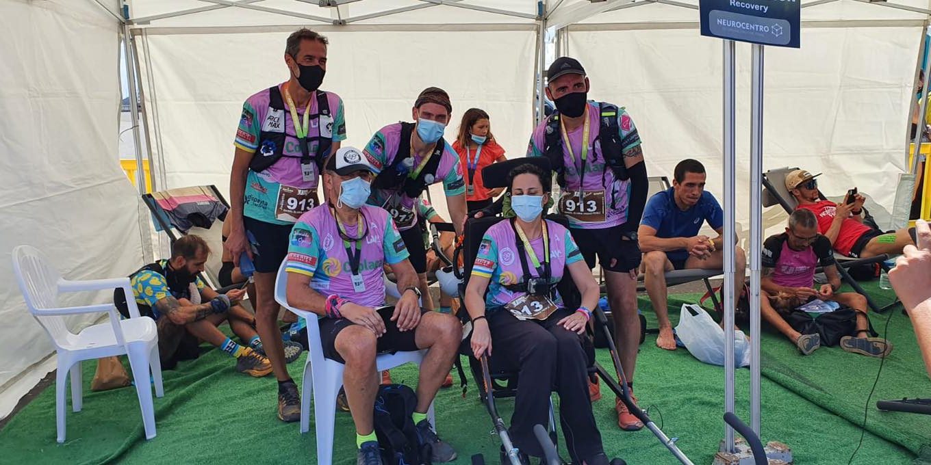 Entre bromas y risas montamos la joelette. Con la salida desaparece el cosquilleo. Segun empieza el trazado de la carrera nos enfrentamos a subir, subir y más subir, y vamos con ritmo y buen ambiente; luego la bajada complicandose en algunos momentos por un recorrido con senderos estrechos, mucha piedra suelta y pensando que nuestra compañera Isa iba en nuestras manos.